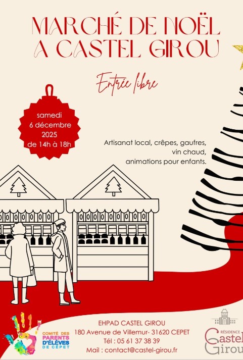 Le comité des Parents d’Elèves de Cépet et l'EHPAD Castel Girou organisent un marché de Noël le samedi 6 décembre 2025 de 14h00 à 18h00.
