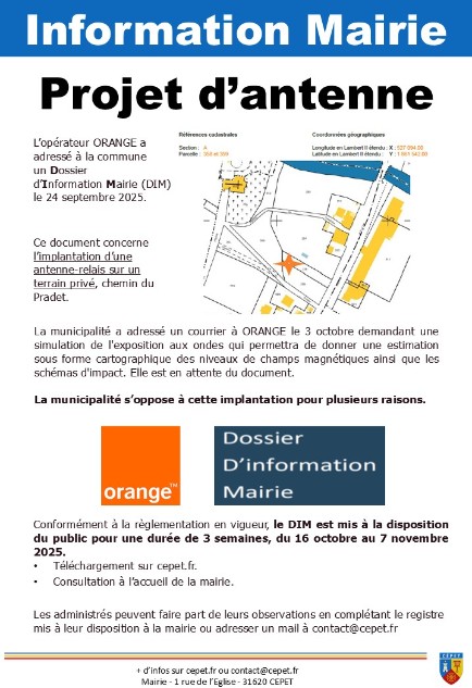 L’opérateur ORANGE a adressé à la commune de Cépet un Dossier d’Information Mairie (DIM).