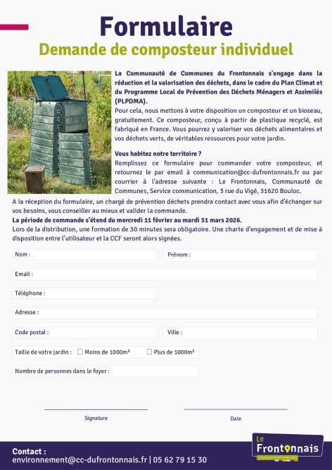 - Remplir le formulaire en ligne, disponible sur notre site : https://www.cc-dufrontonnais.fr/vos-services-usagers/collecte-des-dechets/ / encart "demander un composteur"
