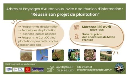 La Communauté de communes du Frontonnais et l'association Arbres et Paysages d'Autun ont le plaisir de vous inviter à la réunion d’information « Réussir son projet de plantation », qui se tiendra :