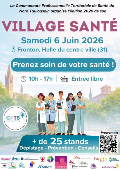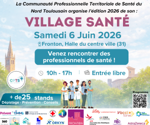 La CPTS Nord toulousain organise un événement de santé publique, le « village santé » le samedi 6 juin 2026 à la Halle du centre-ville de Fronton.